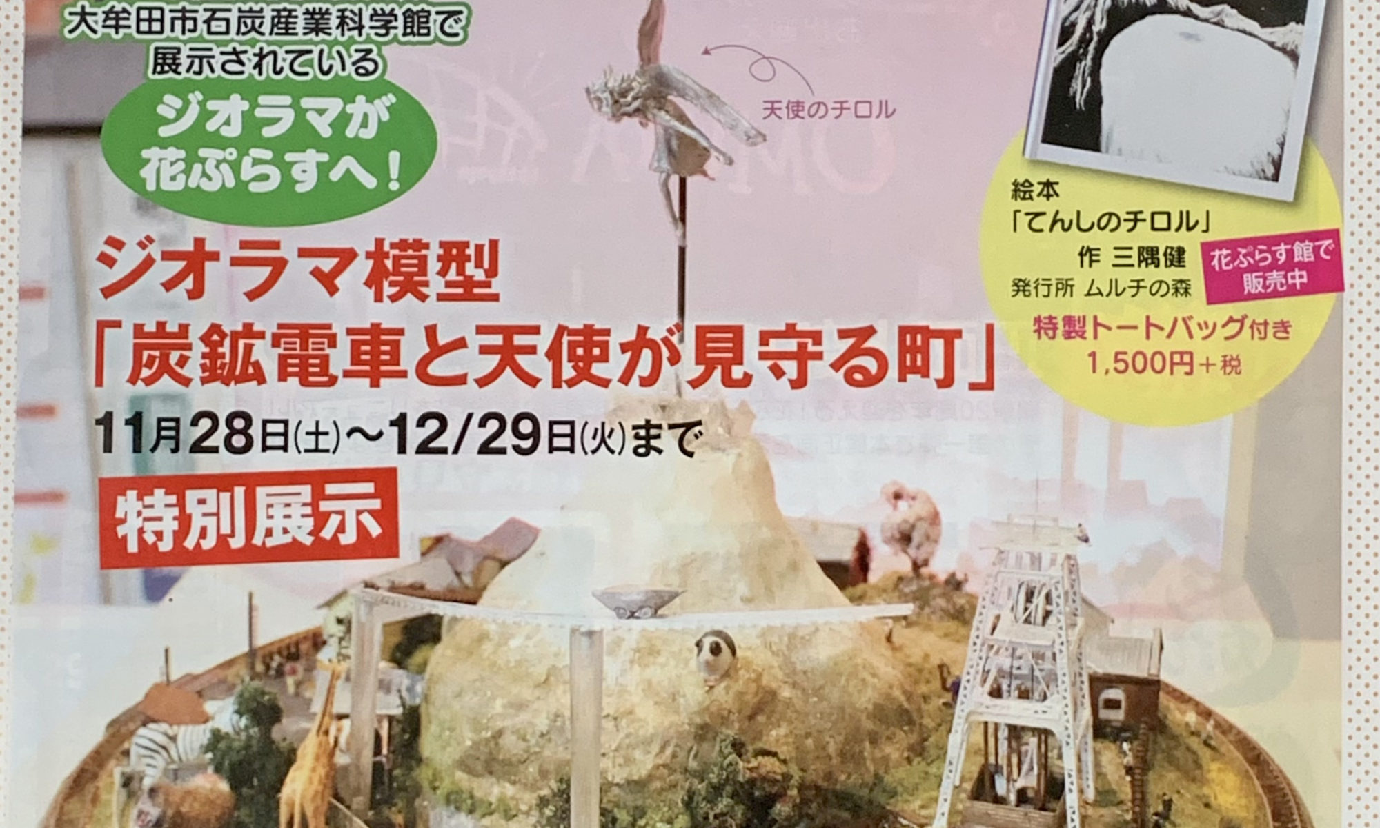 10月末、大牟田市石炭産業科学館に寄贈された、部長作の作品『炭鉱電車と天使が見守る町』は、部長の漫画愛と鉄道愛と大牟田愛が結晶されたジオラマ。これが11月28日〜12月29日の間、道の駅「おおむた」花ぷらす館で特別展示されている。なお、12月19日には、部長も現地訪問予定。(写真は大牟田の地元フリーペーパー「どがしこでん」第50号誌面より)