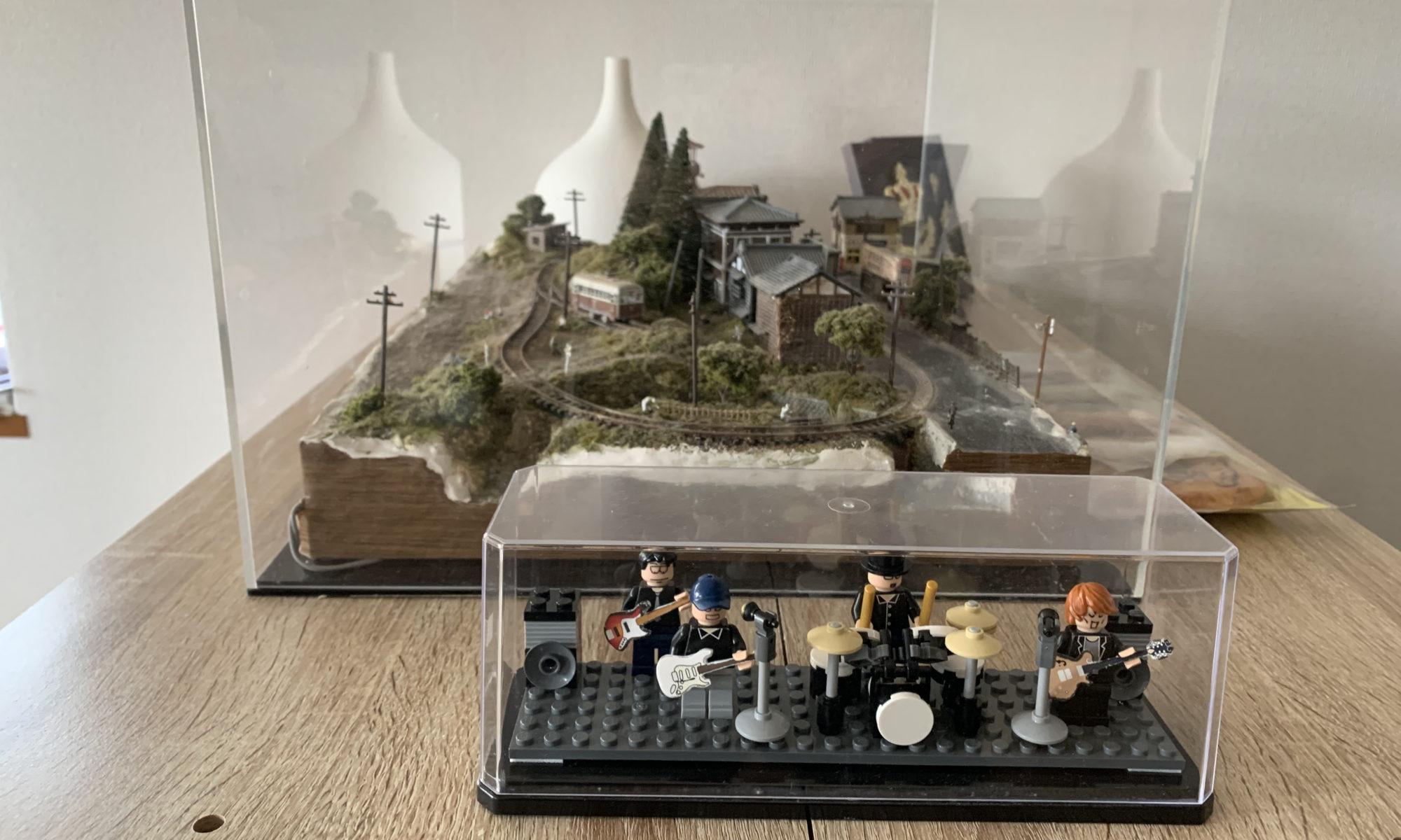 仕事の環境以上に、遊び(提案)場としてのショーケース機能を重視する部室。打ち合わせスペース脇には、部長がかつて(忙しかった頃?)作成したミニジオラマ(東武伊香保軌道風)、そして、副部長がブロックで作成した「ストラト★ダンサーズ」が並ぶ。儲け話に花が咲くとは思えないが、雑談には事欠かないだろう。